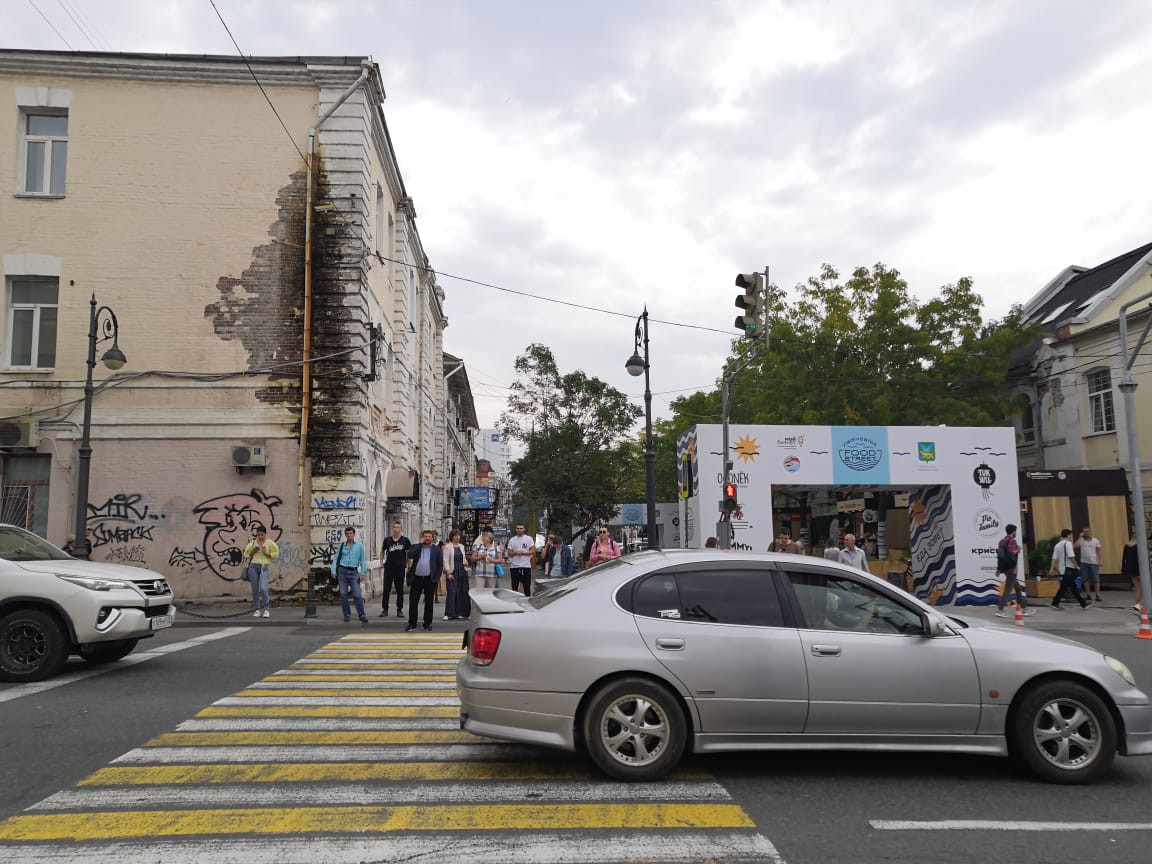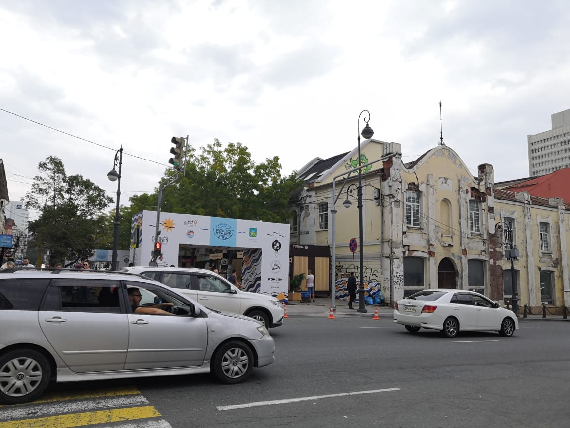 Вход на фестиваль с туристического владивостокского Арбата выглядит катастрофически. Слева и справа его обрамляют два старинных здания: трехэтажный дом 15 и двухэтажный дом 12 по улице Фокина. Кошмарно облупившаяся на огромных площадях штукатурка, заплесневевший (судя по виду) обнажившийся кирпич, наслоения бездарных граффити… Проблема этих фасадов, выходящих на улицу Алеутскую, назрела не вчера, не год назад и даже не пять. Но современный и чистенький фестиваль очень контрастно подчеркивает эту разруху в самом центре столицы Дальнего Востока.