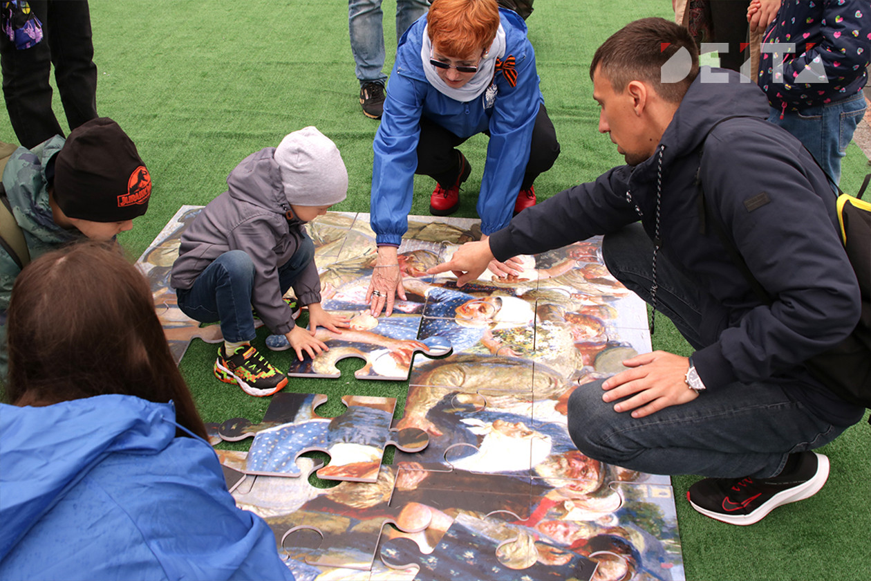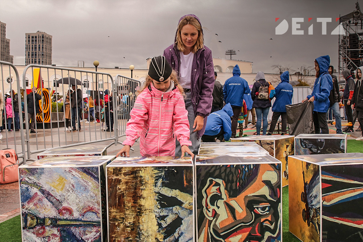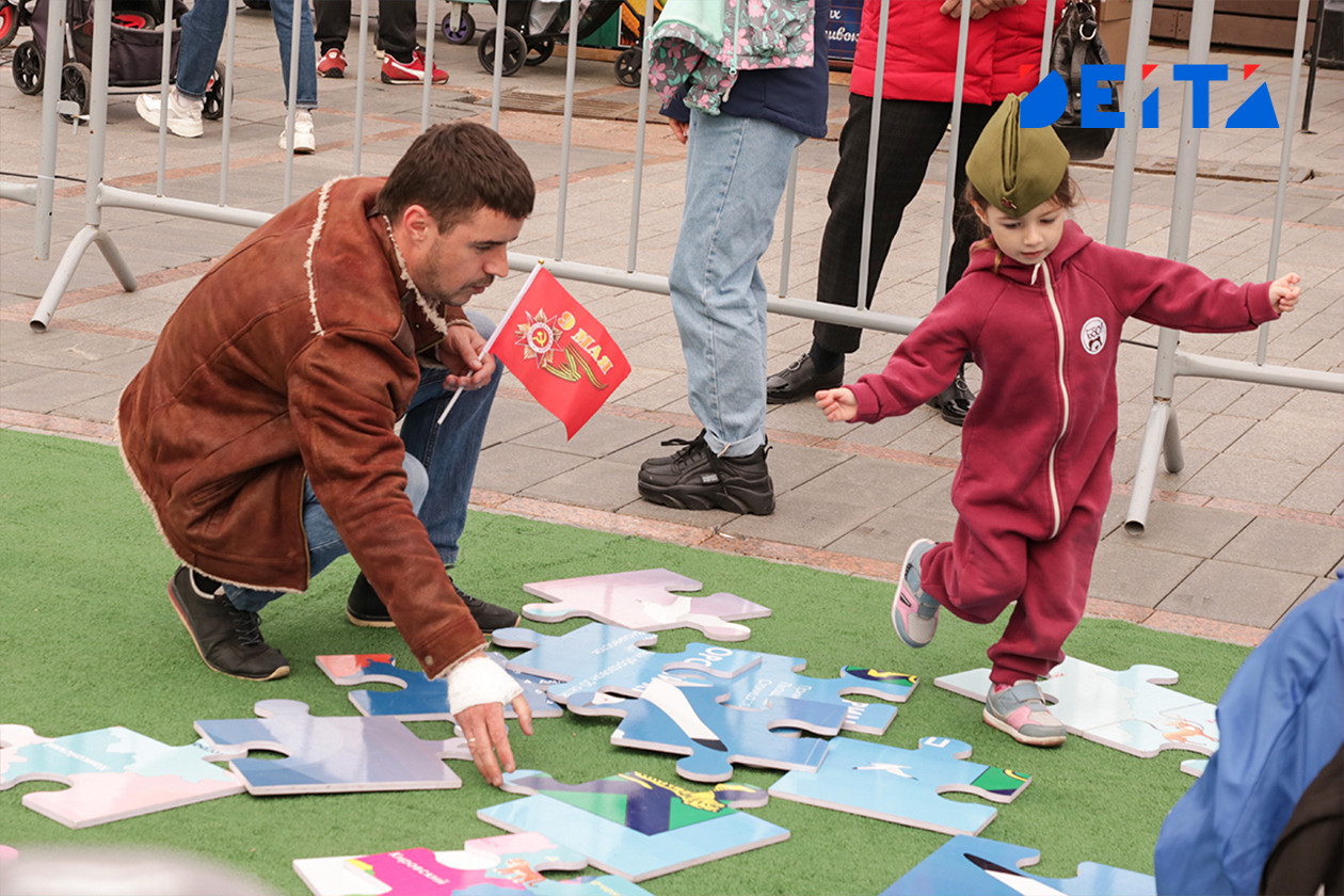 На нижней площадке набережной также было многолюдно, несмотря на периодически шедший дождь. Здесь рисовали портреты студенты художественного колледжа, можно было провести по местности радиоуправляемый танк, родители вместе с детьми читали истории пионеров-героев, участвовавших в событиях Великой Отечественной войны, рисовали, складывали картины с сюжетами Победы из пазлов и кубов. Были концерты, выставка ретро автомобилей, фотозоны.