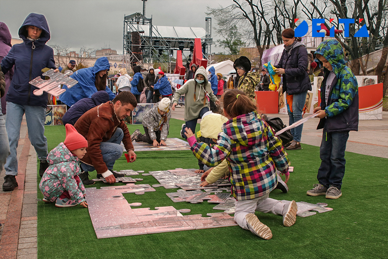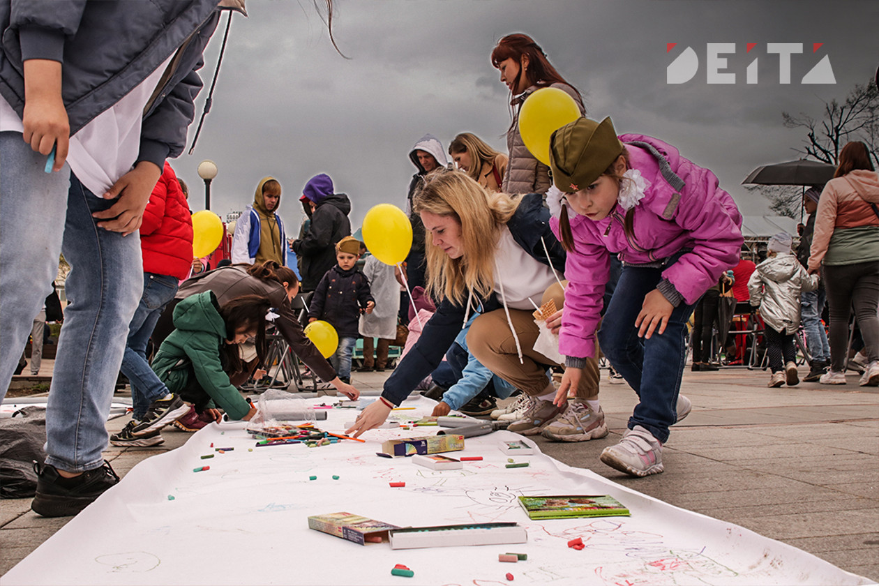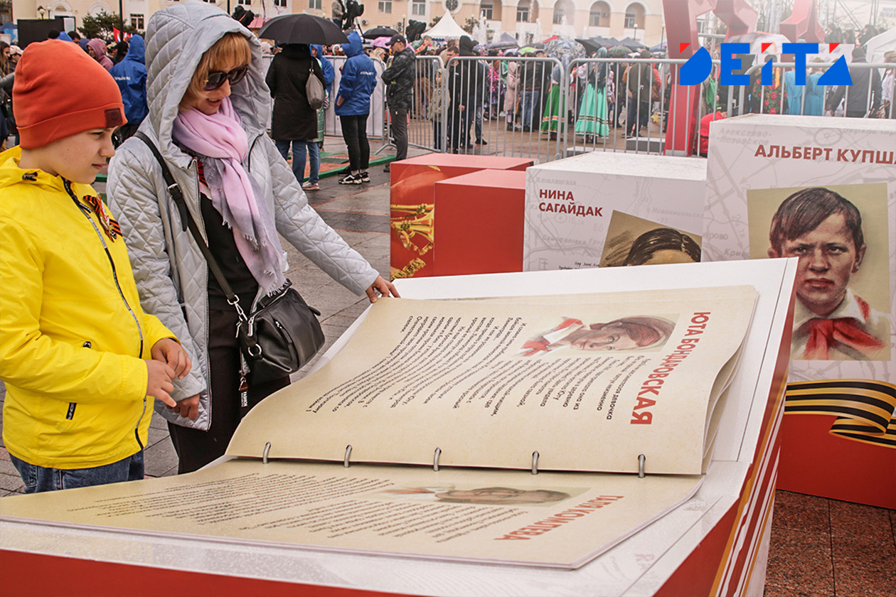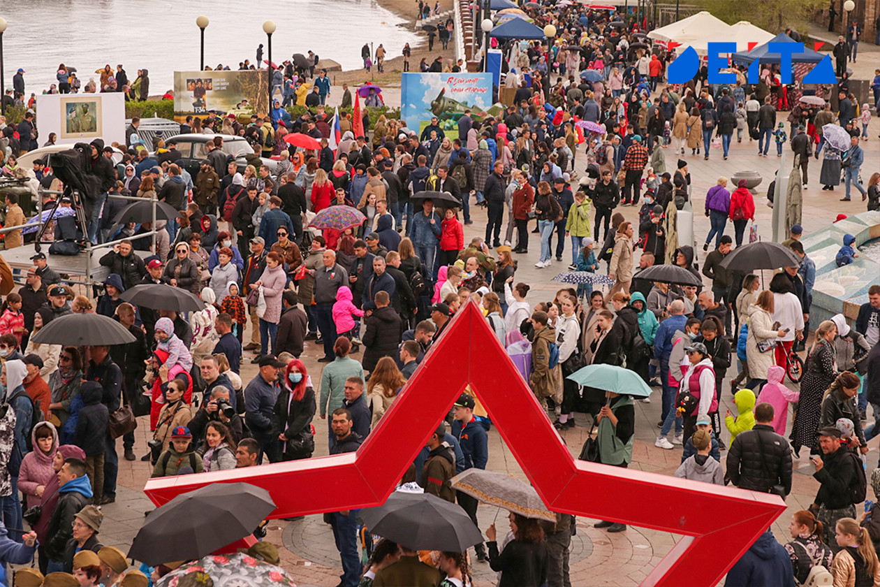 На нижней площадке набережной также было многолюдно, несмотря на периодически шедший дождь. Здесь рисовали портреты студенты художественного колледжа, можно было провести по местности радиоуправляемый танк, родители вместе с детьми читали истории пионеров-героев, участвовавших в событиях Великой Отечественной войны, рисовали, складывали картины с сюжетами Победы из пазлов и кубов. Были концерты, выставка ретро автомобилей, фотозоны.