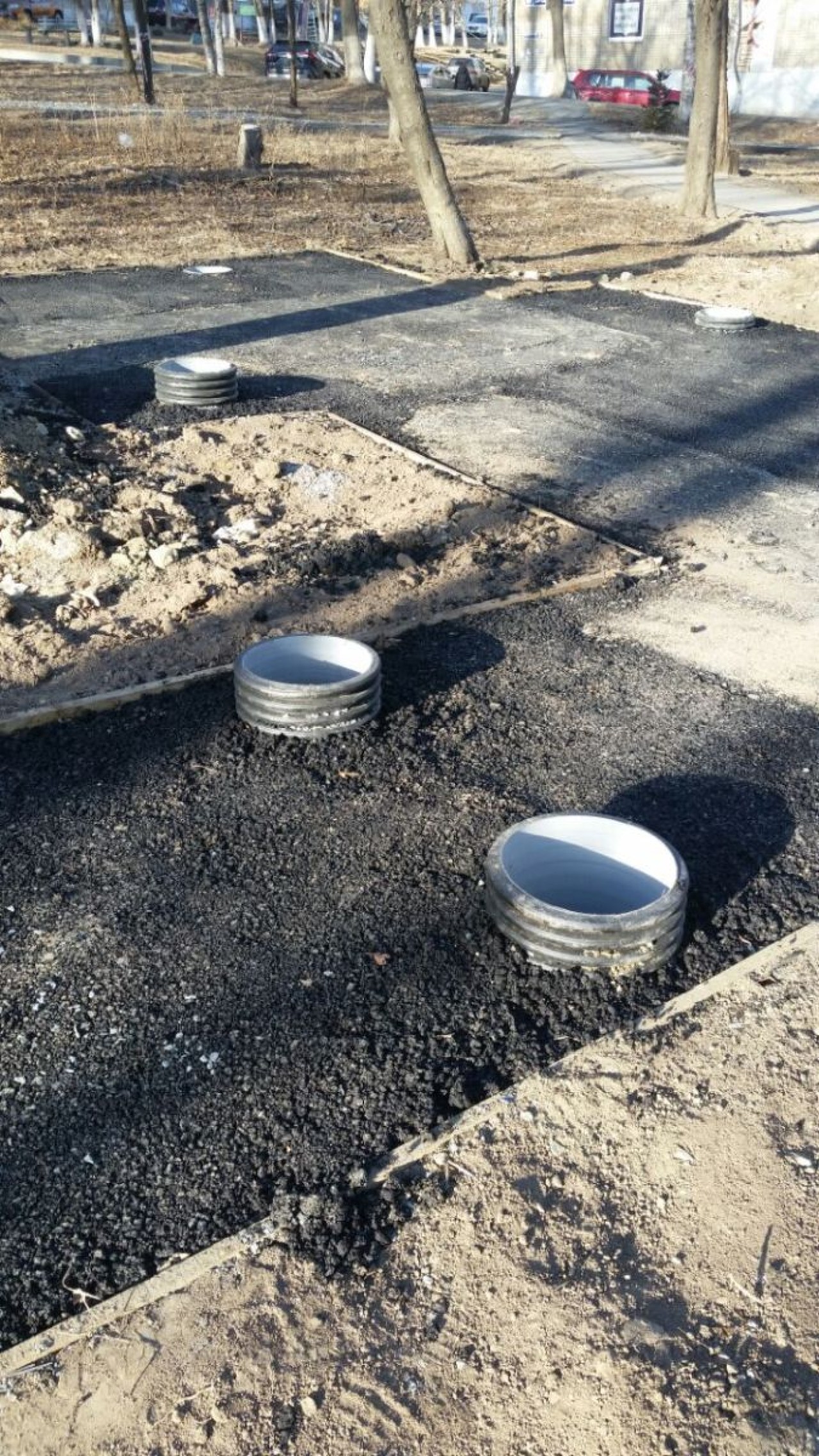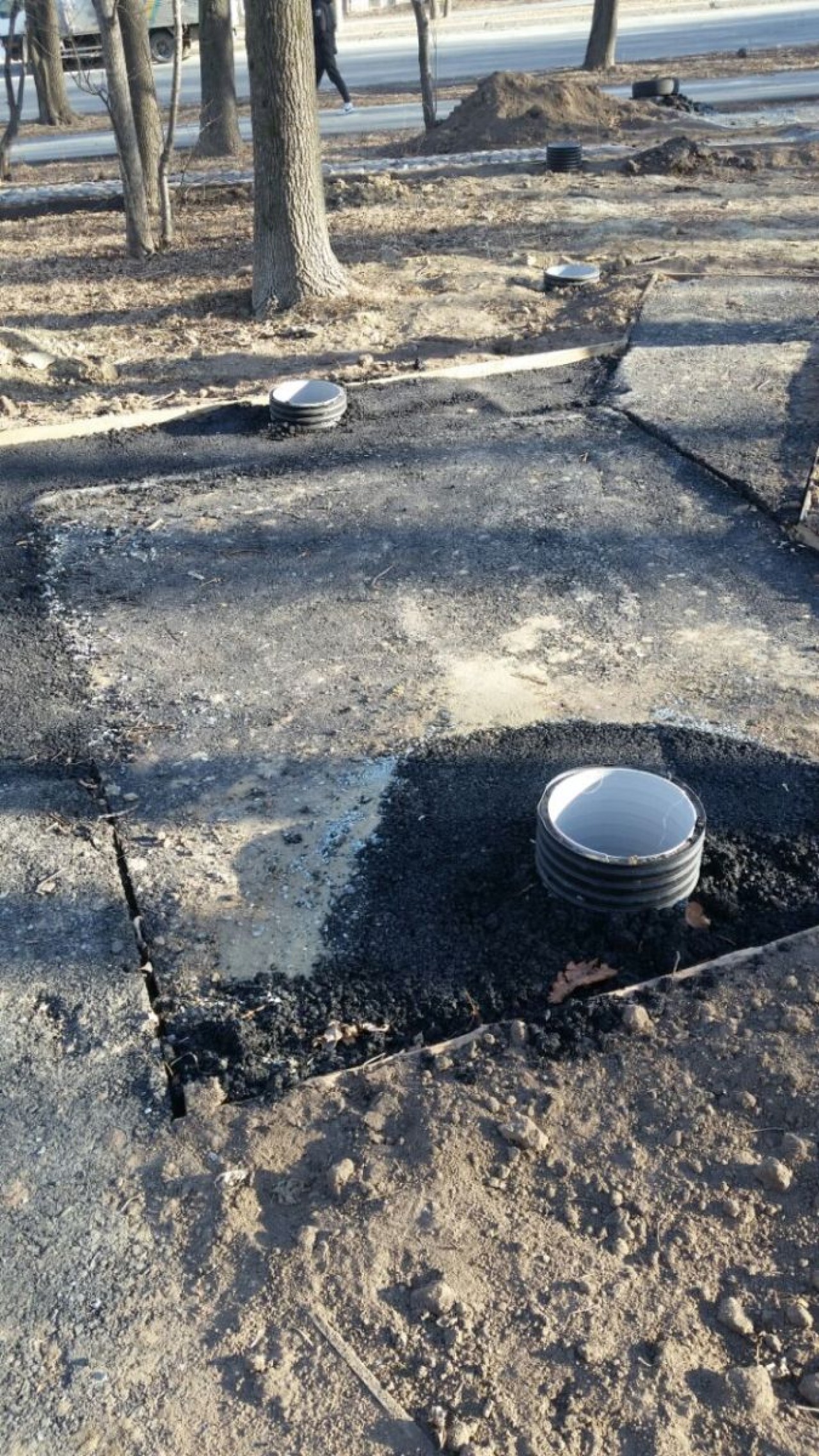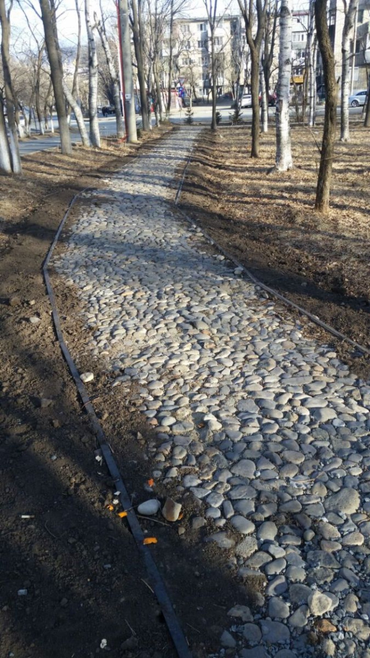 Деревянная опалубка, оставшаяся ещё от первого подрядчика, за лето частично сгнила, а в декабре от мороза доски потрескались. Часть тропинок вымощена галькой, этот вид покрытия тоже постепенно рассыпается, камни отделяются от основания и скатываются на газон. Насыпанная по краям дорожек земля ожидаемо превратилась в грязь.