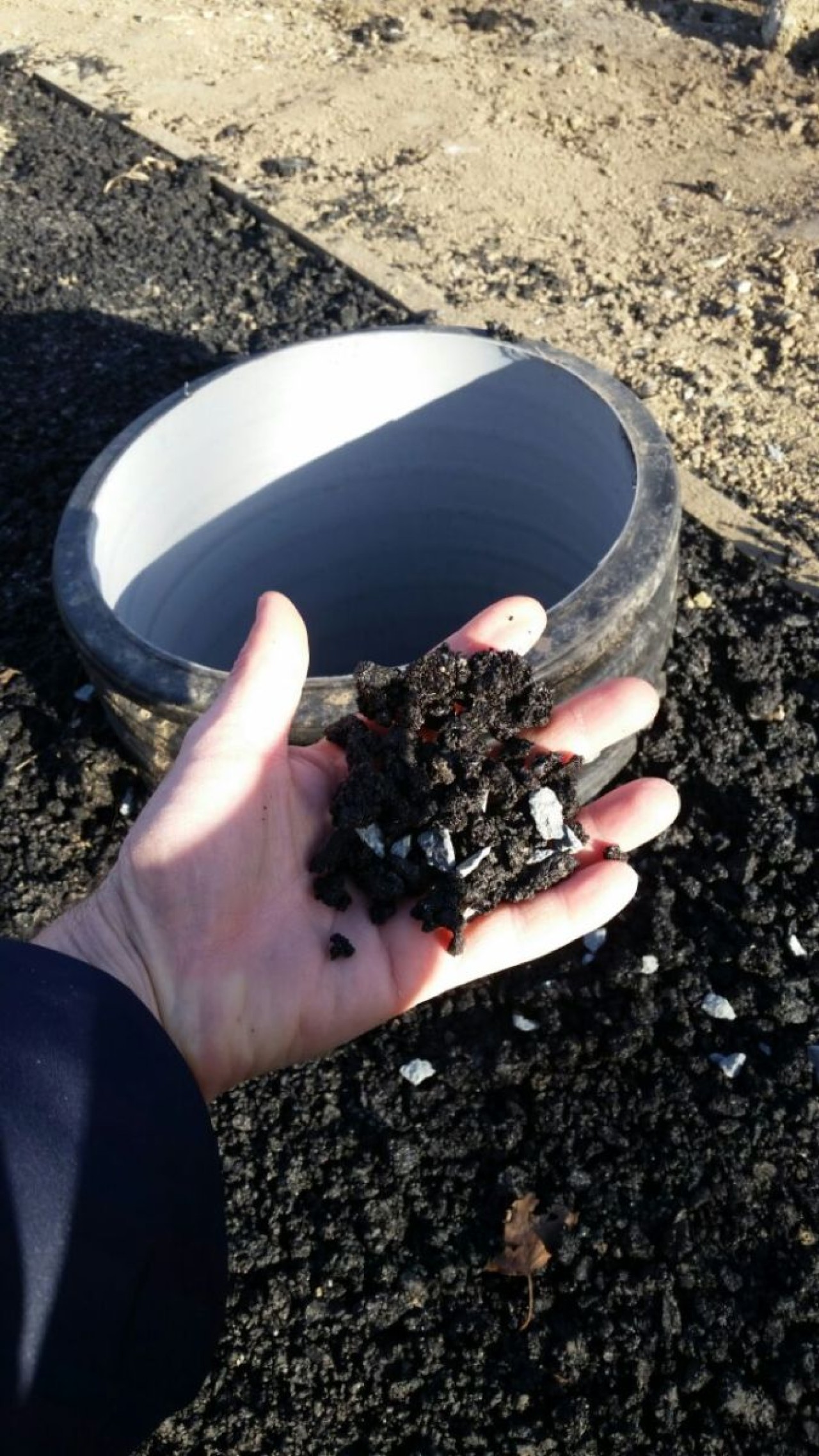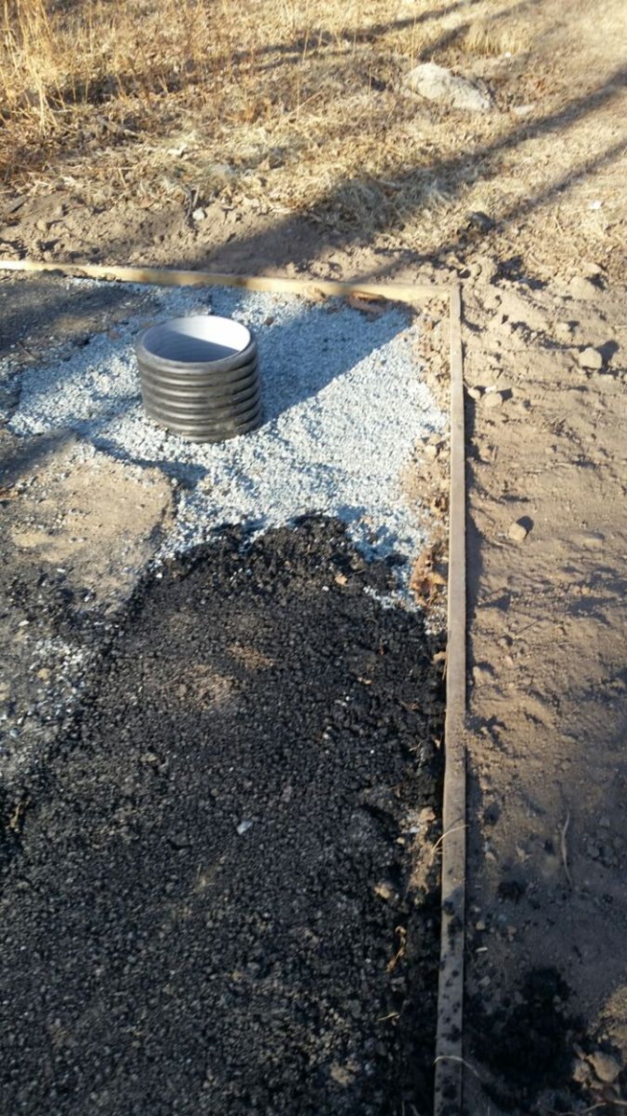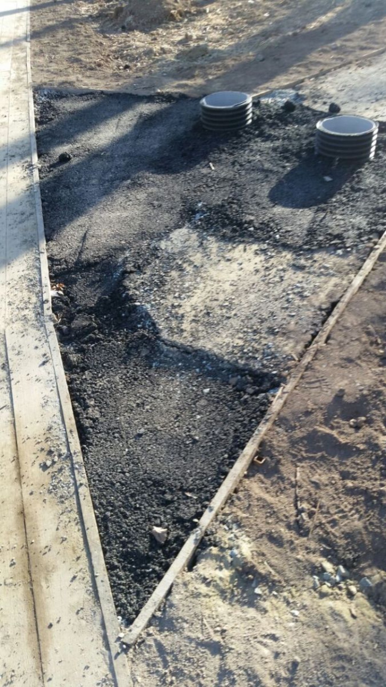 Деревянная опалубка, оставшаяся ещё от первого подрядчика, за лето частично сгнила, а в декабре от мороза доски потрескались. Часть тропинок вымощена галькой, этот вид покрытия тоже постепенно рассыпается, камни отделяются от основания и скатываются на газон. Насыпанная по краям дорожек земля ожидаемо превратилась в грязь.