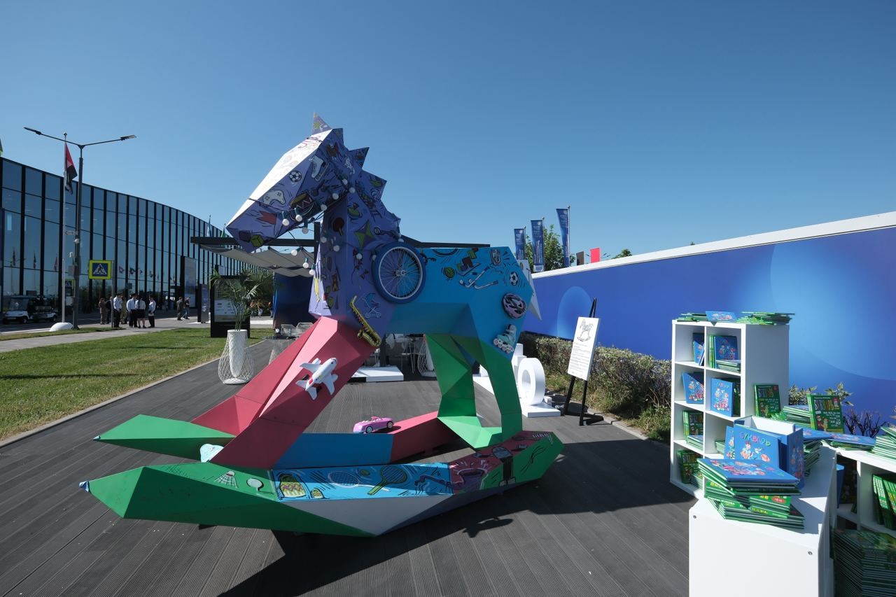 Арт-объект называется «Лошадка, добрый друг детства». Её представили в первый день ПМЭФ, 5 июня. Лошадка выполнена в технике «Танграм» и состоит из составных геометрических фигур, складывающихся в форму лошади-качалки. Помогала с созданием объекта Ирина Дерябина - художник-технолог сцены Большого театра. Необычное художественное решение заключается в том, что некоторые детские товары, которыми украшен арт-объект, являются настоящими.