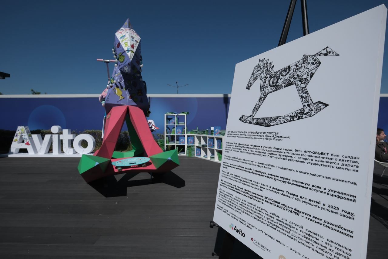 Трёхметровая лошадка-качалка разрисована в яркие цвета, на ней изображены детские игрушки и всё, что ассоциируется со счастливым детством. Среди рисунков самокаты, велосипеды, футбольные мячи, музыкальные инструменты, книжки, детские коляски и многое другое. Как рассказали в «Авито», на создание такого арт-объекта команду вдохновили миллионы сделок, совершённых пользователями на платформе. По подсчётам аналитиков, приблизительная экономия общего бюджета российских семей с помощью Авито за 2023 год составила более 15 млрд рублей.