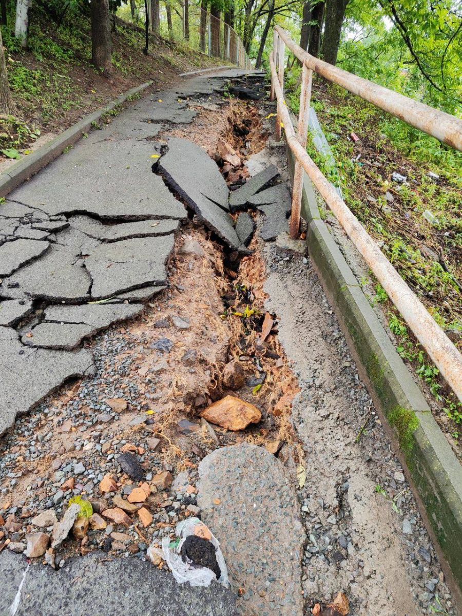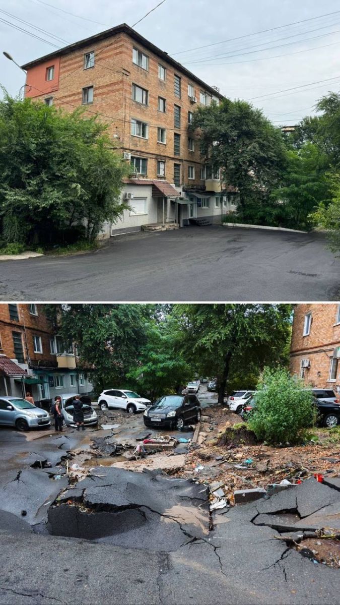 Не выдержал напора тропического шторма асфальт во дворе дома № 14в по улице Фадеева. Там ситуация ещё более комична – этот самый асфальт меняли меньше месяца назад. Для приёма потоков воды во дворе предусмотрена одна небольшая ливнёвка. Оказалось, этого недостаточно: в асфальте образовались такие провалы, что туда затянуло припаркованные во дворе автомобили. Администрация Владивостока уже прокомментировала этот казус: