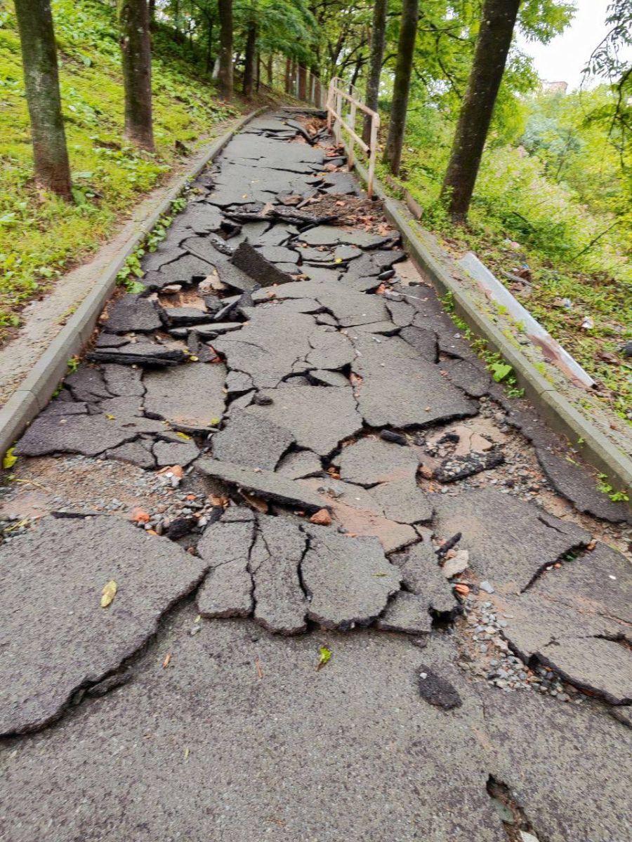 Смыло покрытие на пешеходной дорожке по улице Адмирала Юмашева. Это аллея, по которой дети ходят в ближайшую общеобразовательную школу. Её (аллею) приводили в порядок не так давно.
