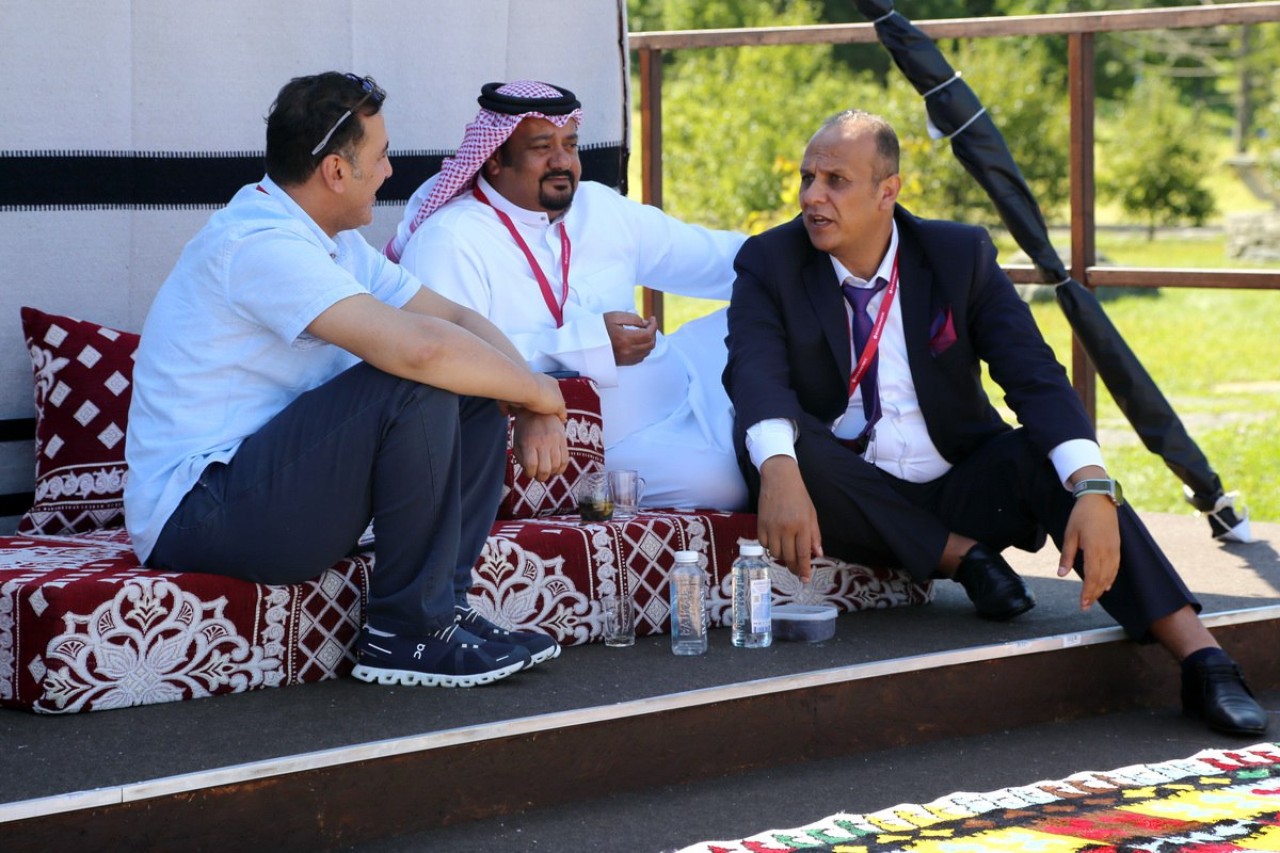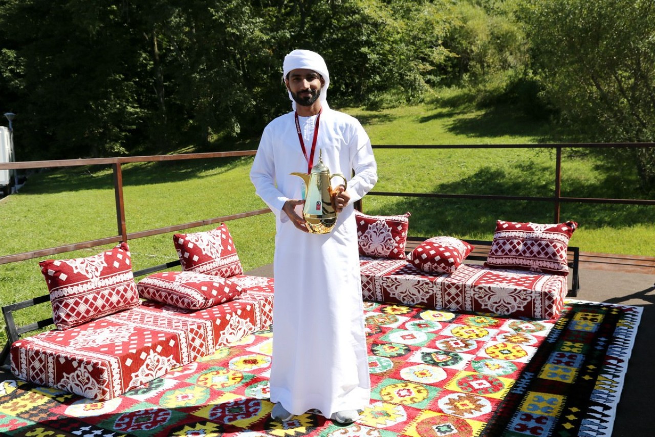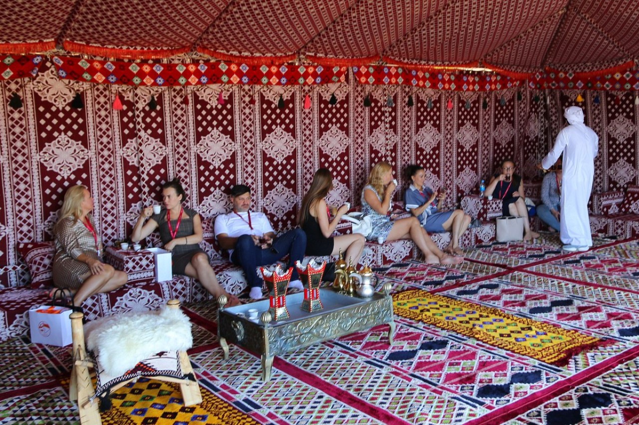 В шатрах гостей форума угощают чаем и кофе, а испить традиционные напитки от жары они могут с уютной атмосфере на маленьких диванах среди шикарных ковров. Кажется, это первые шатры от другой страны, которые расположились среди павильонов дальневосточных регионов.