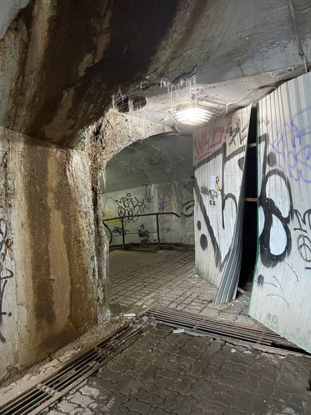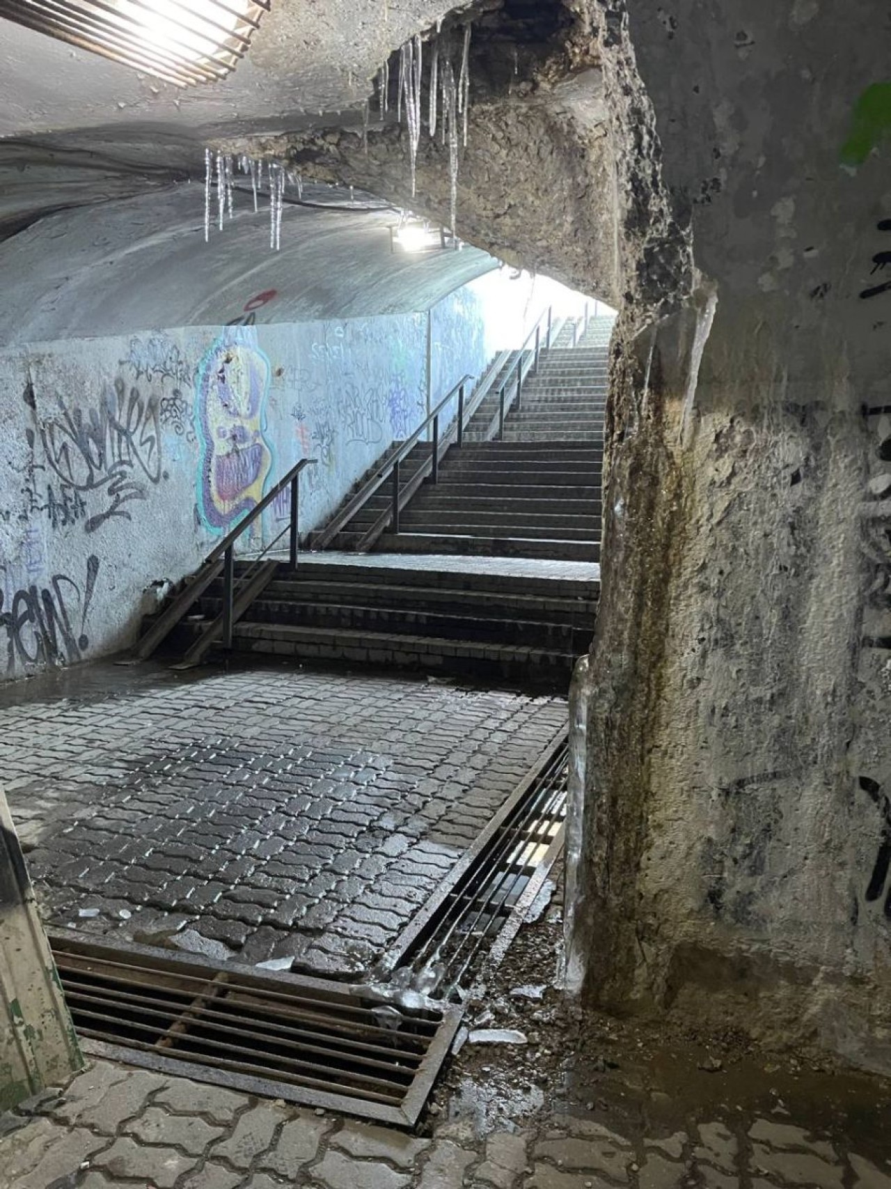 Рассматривалась версия, что здесь нашло выход русло забытой реки. Теперь же цвет и запах течи сигнализирует скорее о сочащихся наружу фекальных водах. А официального подтверждения происхождения течи, судя по всему, до сих пор нет, хотя городская администрация обследовала переход ещё в 2018 году, исключив версию с подтекающим ливневым коллектором.