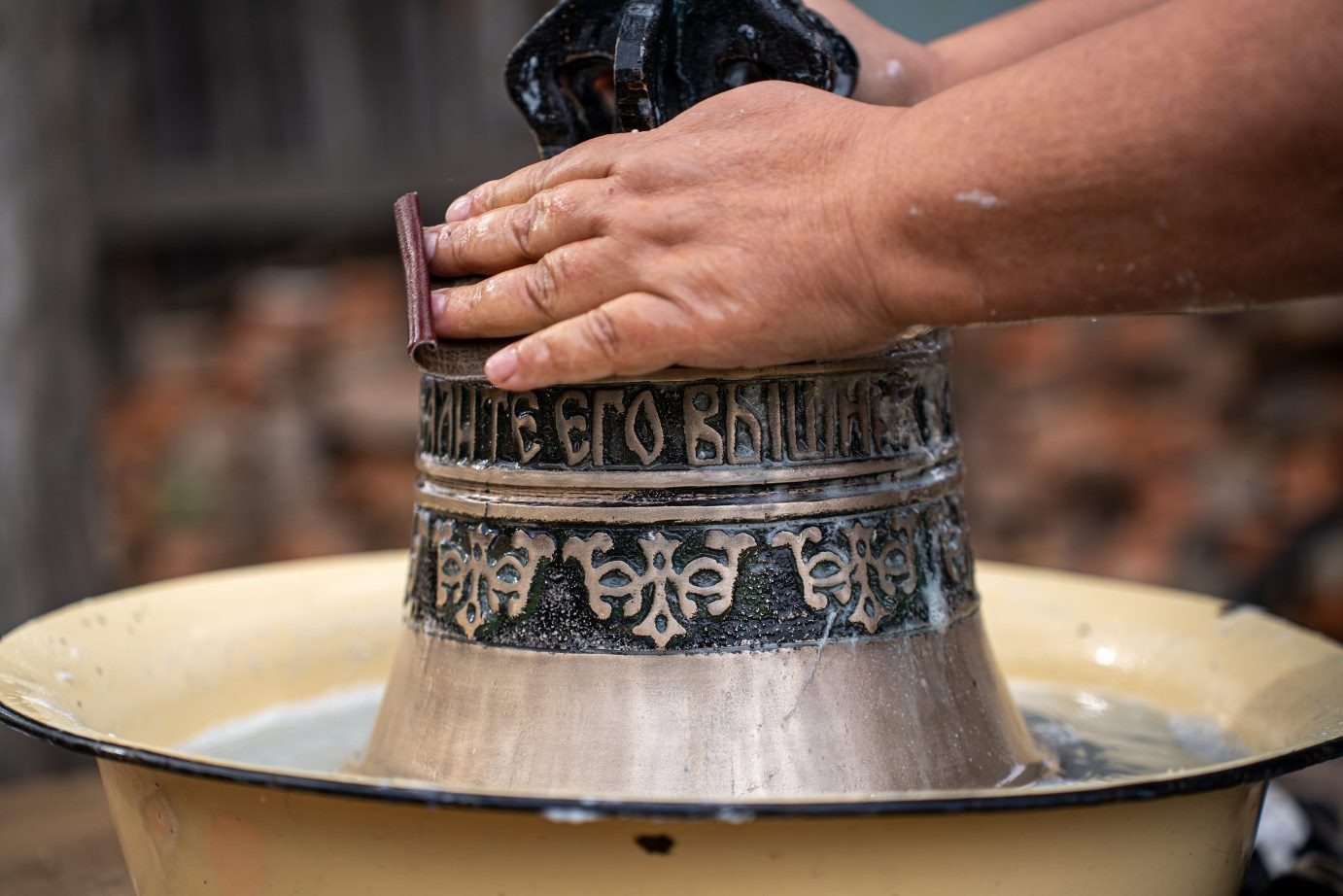 «Колокол хоть и выглядит прочным, на самом деле очень хрупкий, а работа с ним кропотливая. Сперва его нужно очистить от загрязнений, потом обработать смесью из уксуса, соли, муки и воды — она хорошо очищает медь, которая есть в составе. После натереть пастой до блеска и покрыть тонким слоем воска, чтобы не появлялась патина», – делится Домника.