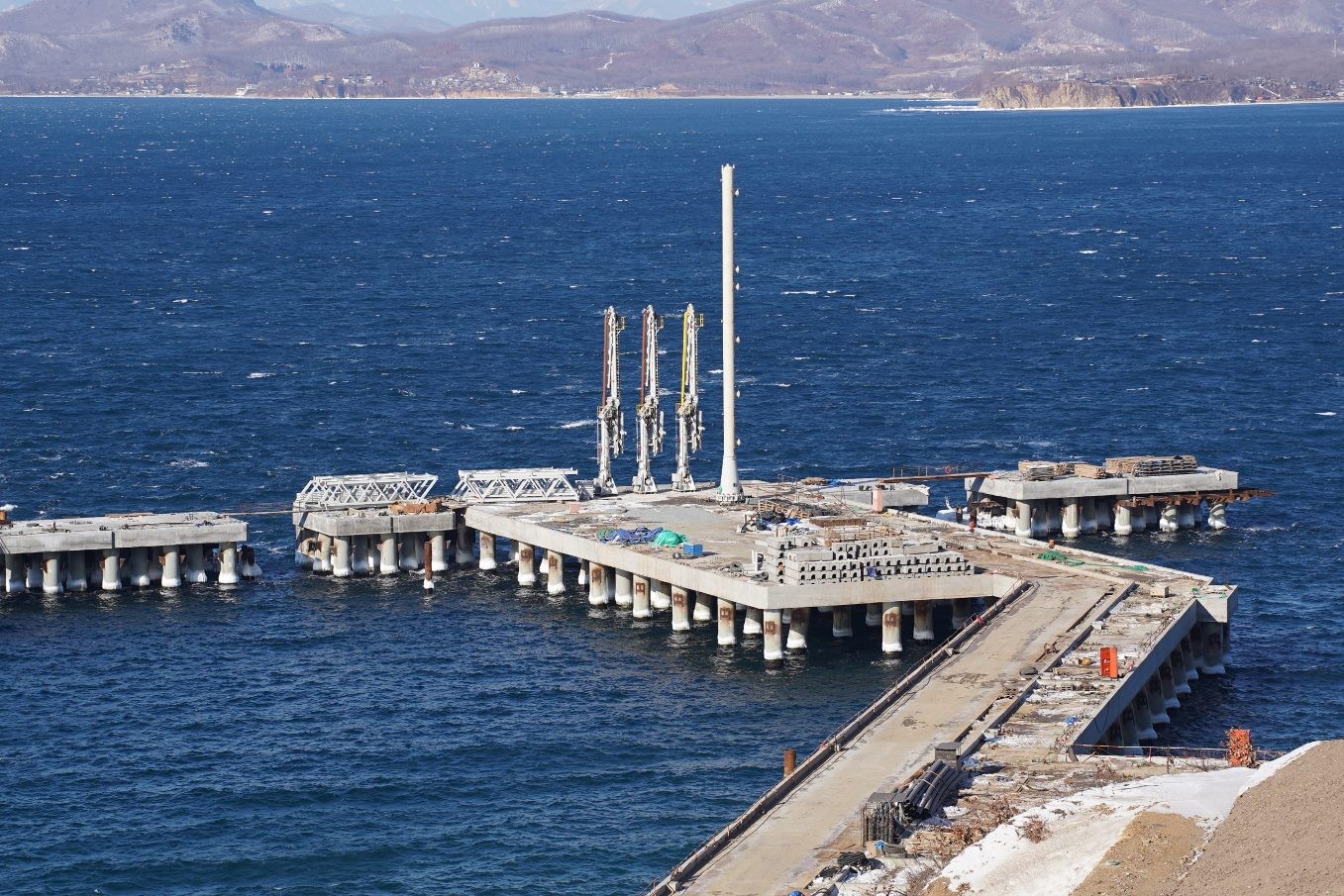 Предназначенный для отгрузки готовой продукции морской терминал включает подходную эстакаду, технологическую площадку, четыре швартовных и столько же швартовно-отбойных палов. Он будет оборудован телескопическим трапом и лазерной системой швартовки, что позволит принимать суда длиной до 195 метров и вместимостью до 53 тысяч тонн, с осадкой до 13 метров.